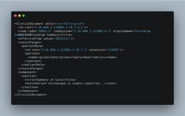 HL7 (CDA) : HL7 CDA messages are document-based. Below is a simplified example.